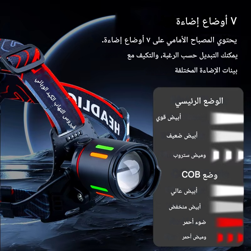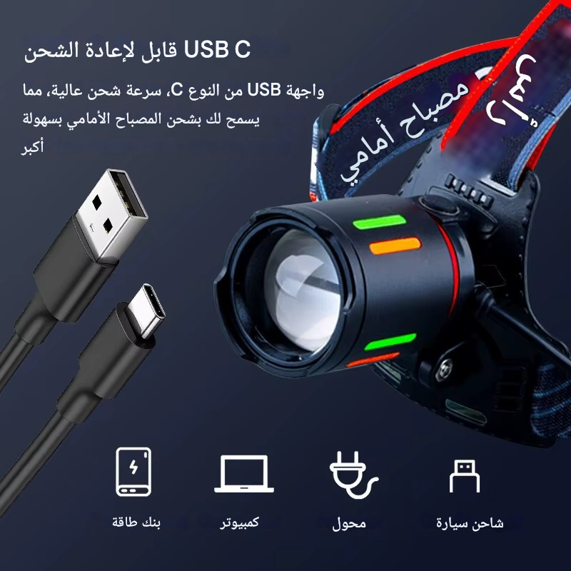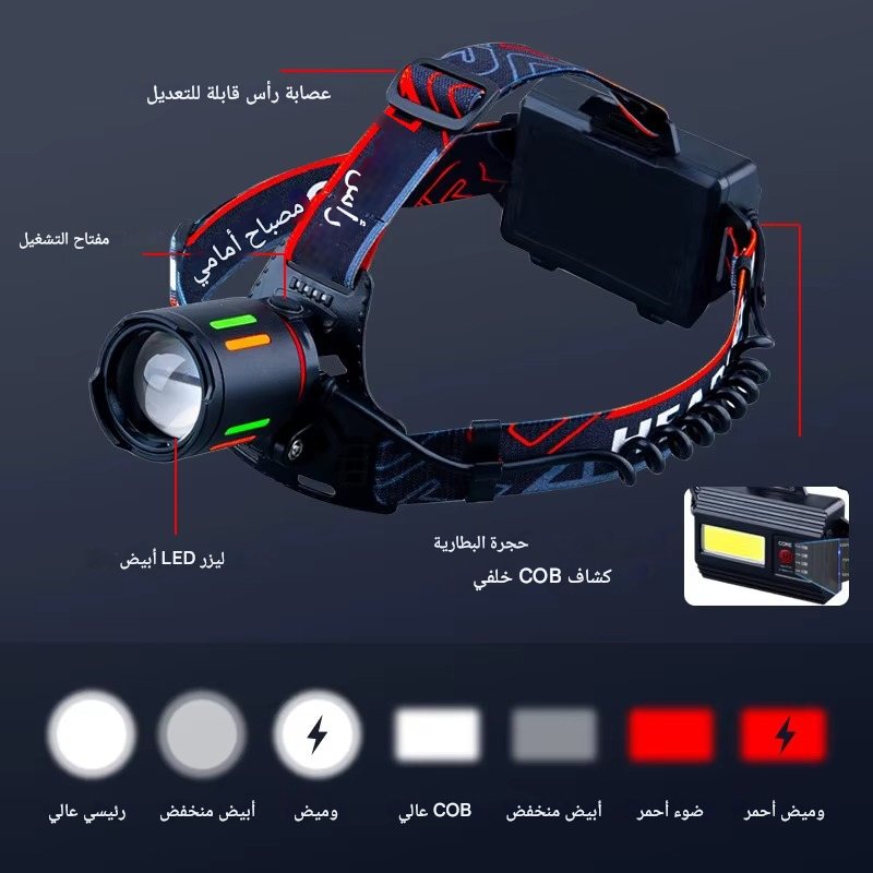 إضاءة فائقة القوة مزود برقائق LED متطورة تنتج سطوعًا يصل إلى 150000 لومن مما يمنحك رؤية واضحة تصل إلى 500 متر سواء كنت تخيم أو تعمل في الظلام بطارية تدوم طويلًا يحتوي على بطارية مدمجة 9000mAh قابلة لإعادة الشحن تدوم حتى 40 ساعة عند الاستخدام المنخفض مع إمكانية الشحن أثناء التشغيل حتى لا تتوقف مغامراتك أبدًا تصميم مقاوم للماء والصدمات مصنف IP67 لمقاومة الماء مع غلاف محكم الإغلاق يحميه من الأمطار الغزيرة الثلوج وحتى السقوط العرضي مما يجعله مثاليًا لمختلف الظروف الجوية راحة ومرونة في الارتداء خفيف الوزن 3.1 أونصة فقط مع شريط رأس مرن وقابل للتعديل إضافة إلى إمكانية تدوير رأس المصباح حتى 90 درجة لتوجيه الإضاءة حسب الحاجة متعدد الأوضاع لحاجاتك المختلفة مزود بستة أوضاع إضاءة تشمل الضوء القوي الضوء الضعيف الضوء الأحمر للطوارئ ووميض SOS لمساعدتك في جميع المواقف سواء في المغامرات أو العمل
